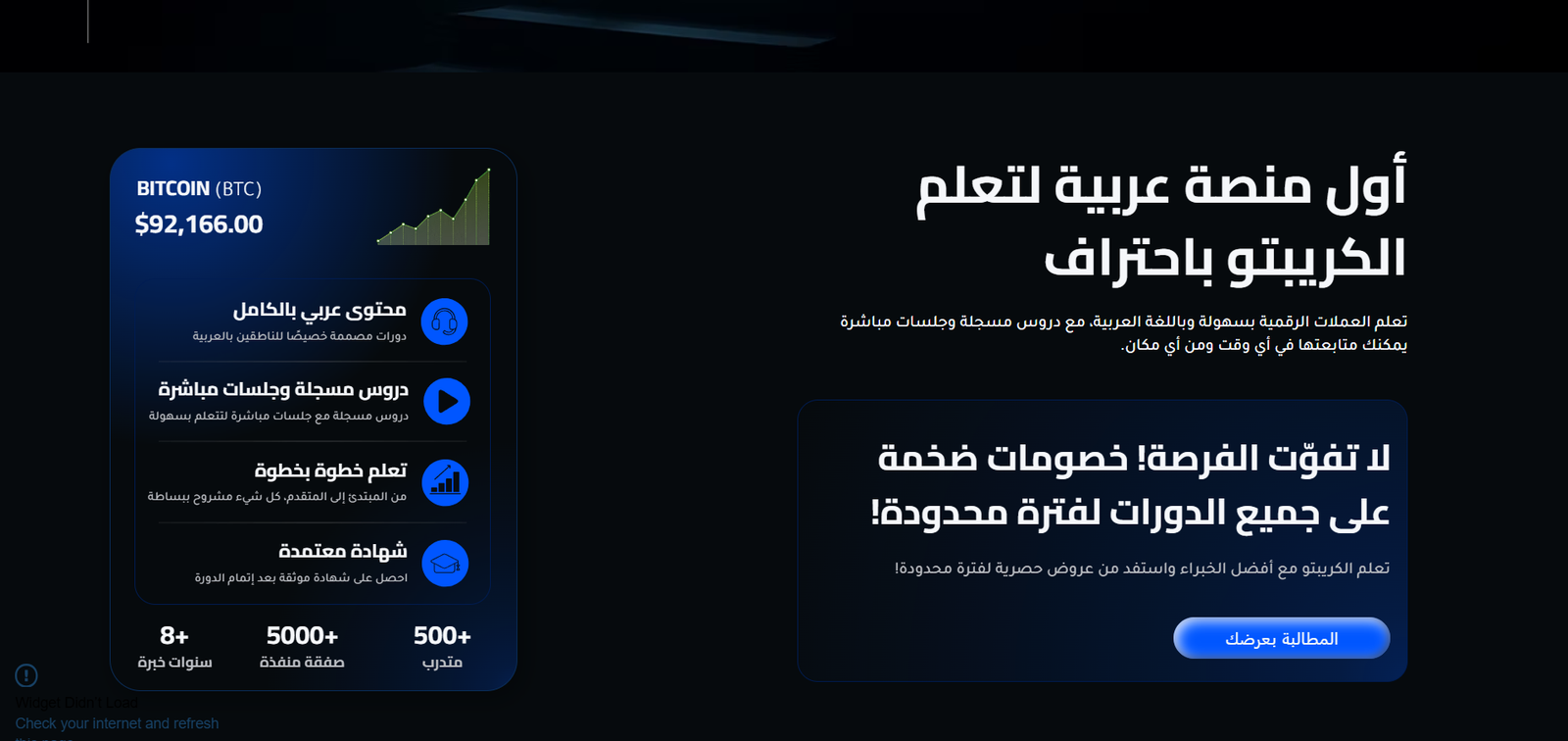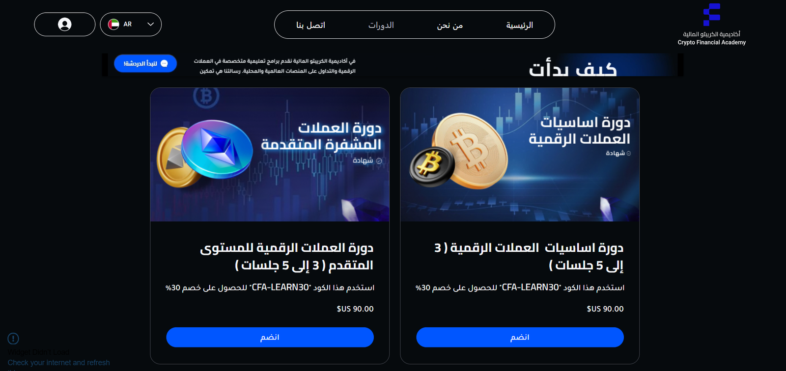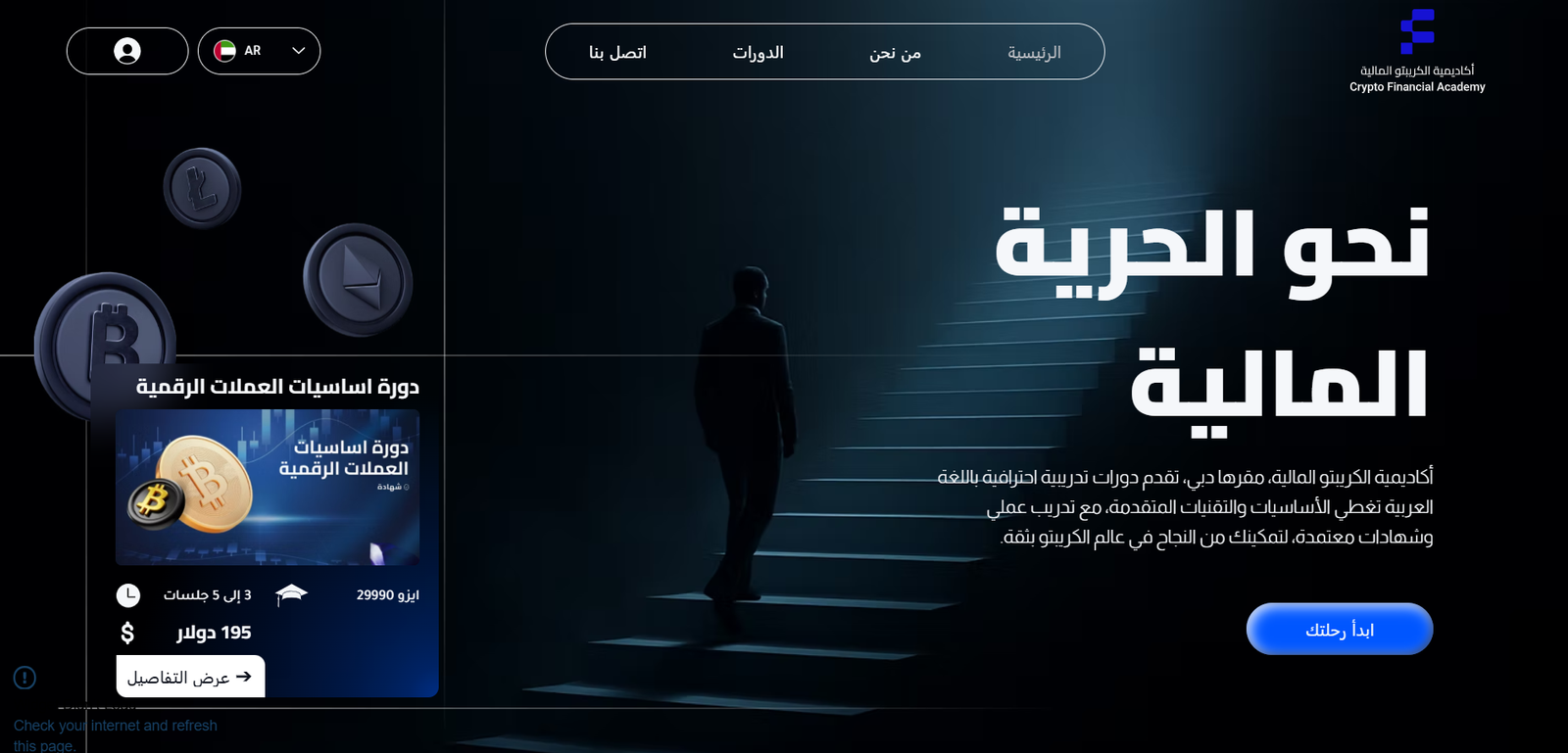 We developed a fully responsive and user-centric webapp for CFAcademy, a Dubai-based platform offering Arabic-language training in cryptocurrency trading, blockchain fundamentals and investment strategies. The site presents their programs in a clear, modern layout — guiding users from program overview to landing page to enrollment — while highlighting key benefits such as ISO 29990 certification, step-by-step learning, practical training and community support.